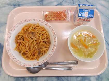 久しぶりのスパゲティーナポリタンの提供です。スパゲティーナポリタンは、日本で生まれた洋食料理です。学校のナポリタンは、玉葱、人参、マッシュルーム、ピーマン、ベーコン、豚肉等が入り具だくさんです。ケチャップの他、ホールトマト、トマトピューレを使用して、味付けしました。よく食べていました。スープにも、たくさんの野菜を使用し、野菜をたくさん使用した洋食料理になりました。