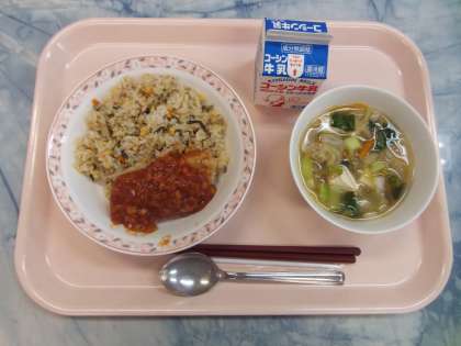 高菜チャーハンは、高菜漬けの塩味、うま味を利用して、豚挽肉、炒り卵等が入ったチャーハンです。高菜漬けからの程よい塩味が出ました。かじきのチリソースは、カジキマグロを揚げて、チリソースを絡めて配缶しました。チリソースは、好きな味付けのようで、よく食べていました。青菜のスープには、青梗菜、白菜、玉葱、人参等の野菜を使用し、具だくさんな中華風野菜スープに仕上がりました。(木)