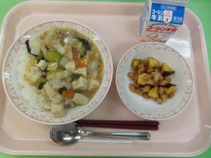 豆腐の中華煮丼は、八宝菜風の野菜あんかけに豆腐を加えた料理です。たくさんの野菜、豆腐、豚肉、帆立貝などを使用し、具だくさんで、ヘルシーな丼です。さつまいもと大豆の甘辛揚げは、素揚げしたさつまいもとでんぷんをまぶして揚げた大豆を、甘辛いたれに絡めた料理です。こちらもヘルシーで、スナック感覚に食べられます。(金)