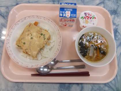 今日は「和食の日」ということで、だしをきかせた和食献立の提供です。親子丼、吉野汁にさば節からとっただしを使用しています。だしをきかせて、素材のうま味を引き出します。また、だしをきかせた和食料理は野菜もたくさん使用していて、素材そのものの味を感じられ、栄養バランス的にも優れた献立になります。