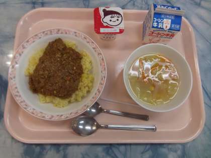 駒中のドライカレーライスは、ごぼうと大豆のみじん切りをミートソースに加えているのが特徴です。その他にも、人参、玉葱、マッシュルーム等も使用していて、野菜たっぷりなドライカレーライスです。材料をみじん切りにしているので、野菜や豆が苦手な人でも食べられるようです。野菜スープも、たくさんの野菜を使用していて、野菜たくさんのドライカレーライスとスープで、体を温めてくれる料理になりました。(水)