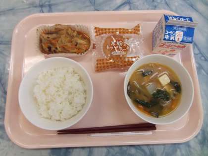 今日の献立は「宮城米給食」の日です。豊島区と交流のある宮城県から無償で「ひとめぼれ」が提供されました。宮城米給食にあわせて、宮城県産の鮭を使用したちゃんちゃん焼き、仙台味噌を使用した味噌汁を提供しました。こうした機会に、宮城県について、色々と学べたらいいと思います。(木)