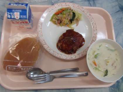 ハンバーグは鶏挽肉と豚挽肉、豆腐を使用しています。豆腐が入ることでヘルシーで、柔らかい仕上がりになります。マッシュルーム入りのトマトソースがかかりました。好みでハンバーグと野菜をパンに挟んで食べます。クリームシチューには、帆立やブロッコリー等秋から冬が旬の食材を使用しました。どちらの料理も食べやすかったようです。(金)