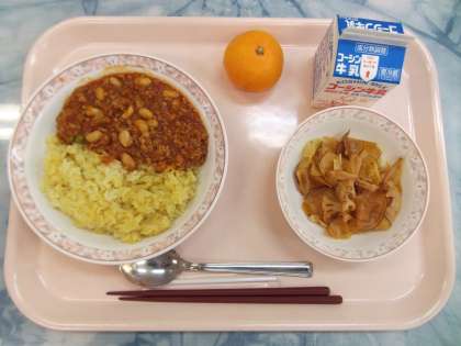 チリビーンズライスは、少々スパイシーなミートソースに、みじん切りにしないでそのままの形の大豆を加えたものを、カレーをきかせた御飯にかけます。ミートソースには、野菜もたくさん使用しています。肉、野菜、大豆等がきちんと摂取できる料理です。大豆もこのような料理では食べやすいようです。野菜チップスは、ごぼう、れんこん、さつまいもを素揚げし、塩味を付けました。こちらも、野菜料理としては食べやすいようです。