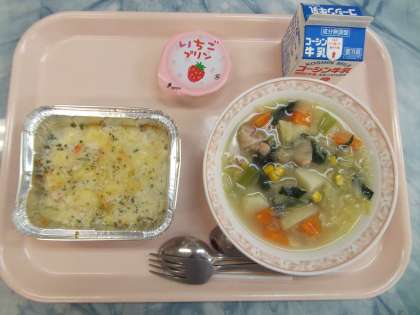 ドリアは、帆立入りシーフードピラフに、ホワイトソースをかけ、ピザチーズとパン粉をのせて焼きました。濃厚な仕上がりで、生徒の好む料理です。よく食べていました。野菜のスープ煮は、キャベツ、人参、じゃがいも、玉葱、小松菜等の野菜類に、ベーコンや鶏肉も加えて一緒に煮込みました。