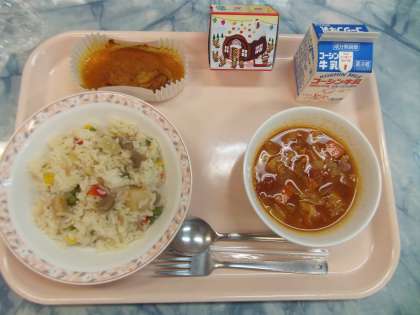 カラフルピラフは、赤ピーマンやコーン、グリーンピース等カラフルな食材を使用したピラフです。帆立貝柱も使用しました。あっさりとした仕上がりです。クリスマスに合わせて生徒達の好きなカレー味のチキン料理を提供しました。