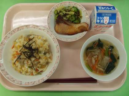 3学期が始まり、1週間が過ぎました。新年の御祝いの気持ちも込めた献立です。ちらし寿司には、れんこんやかんぴょう、人参等を使用しました。学校のちらし寿司には野菜をたくさん使用しています。久しぶりの寿司飯でしたが、よく食べていました。沢煮椀(さわにわん)は千切り野菜のすまし汁です。少々のとろみもついていて、体の温まる一品です。魚、肉、野菜などをバランス良く使用した、和食献立でした。