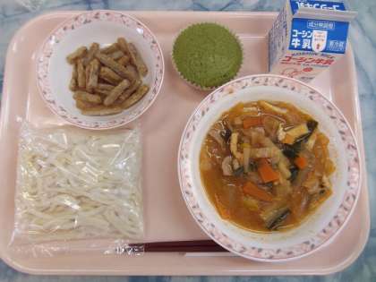 チゲうどんは、白菜キムチを使用した、冬にふさわしい料理です。油揚げ、豚肉等も入りました。ごぼうチップスは、拍子切りにしたごぼうをにんにく風味にして、衣を付けて揚げました。たくさんのごぼうを使用しましたが、スナック感覚で食べられ、よく食べていました。カミカミ料理です。抹茶ケーキは、小豆もたくさん使用し、給食室で焼きました。
