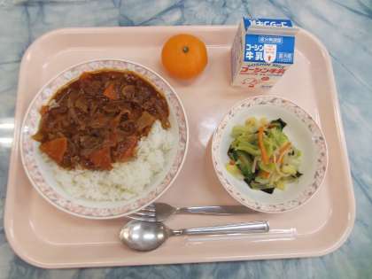 国の補助による牛肉を使用した給食の第2回目です。ハッシュドビーフライスには、玉葱と牛肉をたくさん使用しました。またきのこ類も使用し、肉と野菜をたくさん使用したソースに仕上がりました。冬にふさわしい料理になりました。