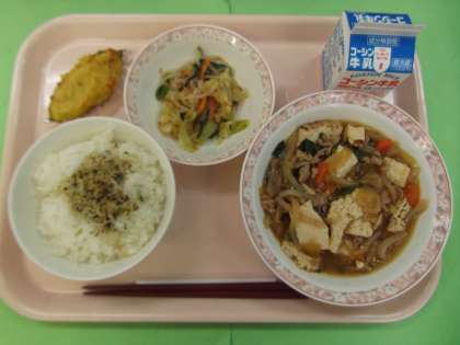 ふりかけは、菜飯の素と粉かつお節、ちりめんじゃこを合わてから煎りした、シンプルな手作りふりかけです。肉豆腐は、焼き豆腐と豚肉をメインとした煮物料理で、玉葱、人参、つきこんにゃく等もたくさん使用しました。食べやすい和食料理です。野菜の梅肉和えは、練り梅を使用したドレッシングを作り、野菜に和えたお浸しで、駒中生には人気のある野菜料理です。よく食べていました。スイートポテトもほぼ、完食でした。