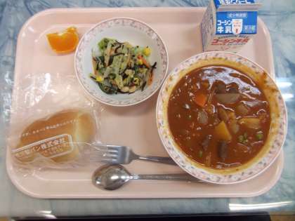 国の補助を受けた和牛給食、第3回目です。学校でのビーフシチューの提供は初めてで、たくさんの牛肉を使用しました。その他給食では、人参、じゃがいも、玉葱、マッシュルーム等の野菜類もたくさん使用します。冬にふさわしい料理です。よく食べていました。ひじきサラダはひじきの他、コーンや大豆等も使用しました。和の食材を使用し、少し目先を変えたサラダです。柑橘類は甘平(かんぺい)という甘味の強い柑橘類を提供しました。