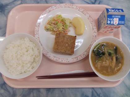 松風焼きは、和菓子の「松風」に見たてた、鶏肉と豚肉を使った和風のハンバーグです。みそでつなぎをつけています。給食では、れんこんやエリンギのみじん切りも入り、しゃきしゃきとした食感が出ました。ヘルシーに仕上がりました。よく食べていました。和風ハンバーグに合う、サラダを提供しました。味噌汁は大根、小松菜、ねぎなどを使用し、野菜類をたくさん使用した、親しみやすい和食給食になりました。