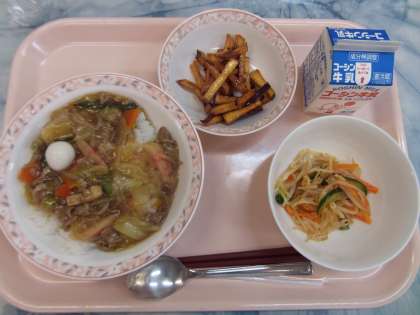 中華丼は、たくさんの野菜と豚肉、魚介類等を使用し、とろみをつけた中華あんかけです。野菜類はかさが減るので、沢山摂取することができます。中華丼は、生徒の好きな料理の一つです。キムチ和えは、キムチの素を使用して、さきいかを加えた和え物です。噛み応えがあります。さつまいものかりんとうは、拍子切りにしたさつまいもを油で揚げ、甘いタレに絡めました。大学芋はよくやるのですが、さつまいものかりんとう(芋けんぴ)は初めてでした。よく食べていました。カミカミ献立になりました。