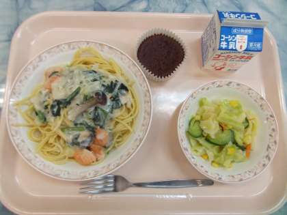 角切りの鮭をたくさん使用し、きのこ、ほうれん草、玉葱、ベーコン等も使用した濃厚なホワイトソースのスパゲティーです。焼き魚の苦手な人でも、このように調理すると食べやすくなるのではないでしょうか?あさってのバレンタインデーにちなんで、チョコレートブラウニーを作りました。チョコレートの割合の高い、焼き菓子です。アクセントにレーズンも入っています。よく食べていました。