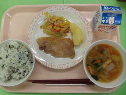 豚肉のにんにく味噌焼きは、豚ロース肉をみそ、にんにく、ねぎ、砂糖、ごま油等で合わせたタレに漬け込み焼きました。甘辛く、中華風の味付けに仕上がりました。よく食べていました。吉野汁は、とろみを付けた野菜をたくさん使用した汁物です。とろみがついているので体が温まりました。