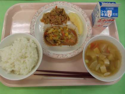 鮭のちゃんちゃん焼きは、焼いた鮭の上に、味噌をベースにバターで炒めた野菜をのせて、再度焼きました。北海道の郷土料理です。味噌バター味がよくきいているので、白いご飯によく合います。切り干し大根の煮物や、けんちん汁には、野菜類をたくさん使用しました。果物はりんごの提供で、全体でかみかみ献立になりました。