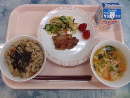 今日はひな祭り献立です。ちらし寿司には、穴子を混ぜました。穴子にはビタミンAが豊富に含まれていて、免疫力アップにつながる食材です。鶏肉の照り焼きは、鶏肉を甘辛いタレに漬け込み、焼きました。生徒の好きな料理です。かき玉汁には、手まり麩も加え、華やかに仕上がりました。彩りの良い、春らしい献立でした。