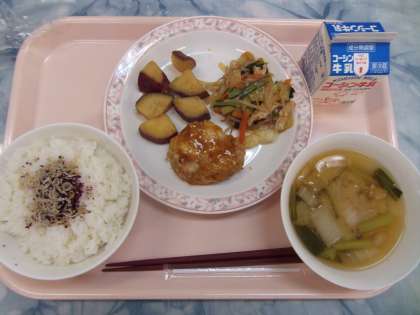 ゆかりふりかけは、ちりめんじゃことごまを使用して、ゆかりと一緒に、から煎りしました。カルシウムを沢山摂取できるふりかけです。チーズ入りつくね焼きは、豆腐を使用した鶏ミンチに、角切りチーズを混ぜて焼き、甘辛いたれをかけました。食べやすい料理のようで、よく食べていました。煮浸しは、野菜を甘辛く煮ました。サラダやお浸しではなく、煮物での提供でした。箸休めにさつまいもを甘く煮たものを提供しました。ヘルシーな和食献立でした。