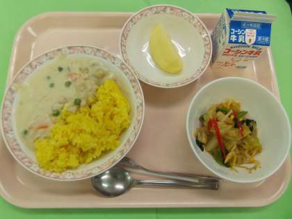 ピラフのクリームソースかけは、ターメリックライスに濃厚なホワイトソースをかけていただきます。ホワイトソースには、鶏肉、ホタテ、野菜、きのこ等をたくさん使用しています。チーズの風味もあり、食べやすい料理でした。カラフルサラダは、りんごや玉葱をすりおろした特製ドレッシングを作り、コーンやパプリカ等を加えた野菜に和えました。彩りよい献立になりました。