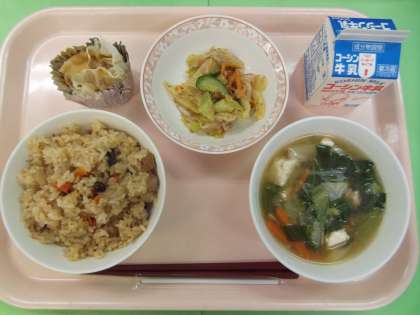 おこわは、うるち米:餅米=約2:1の割合で作りました。焼豚、帆立貝、きのこ類、人参等を加えた、具だくさんなおこわです。オイスターソースを使用したので、中華風に仕上がりました。ジャンボ焼売は直径約12cmの皮に、豆腐を使用した豚挽肉あんを包み、蒸しました。豆腐を使用しているのでヘルシーな仕上がりです。久しぶりの提供で、駒中生の人気メニューです。レタススープには、青梗菜も入り、青菜たくさんの中華スープになりました。