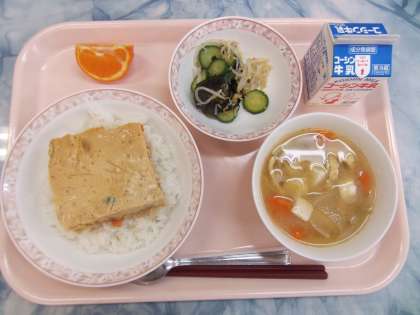 駒中の親子丼は、甘辛く味付けして蒸し焼きに仕上げた大きな卵焼きを1枚、ご飯の上にのせます。滑らかな仕上がりです。親子丼は和食料理の中で、駒中生からの人気の高い料理です。わかめ酢は、わかめときゅうり、もやしなどを使用した酢の物です。味噌けんちん汁は、根菜類、豆腐、じゃが芋等を使用し、具だくさんな汁物になりました。体の温まる献立でした。