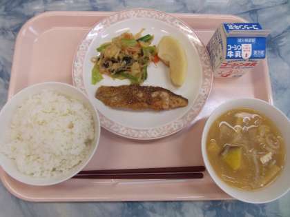 目鯛の韓国風焼きは、魚をにんにく、生姜、ねぎ、唐辛子等をきかせた甘辛いタレに漬け込み、ごまをふって焼きました。韓国風の味付けの焼き魚です。切り干し大根は、今回は煮物ではなく、さっと湯がき、中華風のドレッシングを作り、他の野菜と一緒に和えました。切り干し大根が入ることで、カミカミメニューになりました。味噌汁にはさつまいもを加え、さつまいもの甘味が感じられる味噌汁になりました。