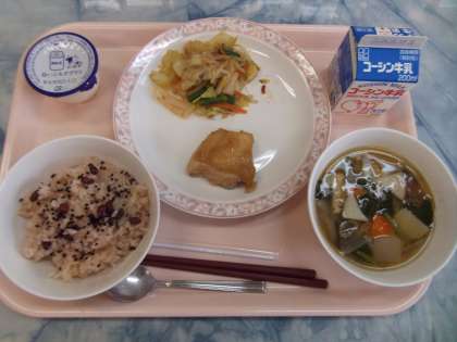1年生の入学、2・3年生の進級を御祝いした献立です。鶏肉は、にんにく、味噌、ねぎ、しょうが、ごま油などを合わせた調味液に漬け込み焼きました。チキン料理は、皆さん得意です。のっぺい汁は、さば節と昆布だしをよくきかせ、野菜をたくさん使用し、とろみをつけた汁物です。お浸しにも、野菜をたくさん使用しました。肉と一緒に野菜もきちんと食べましょう。