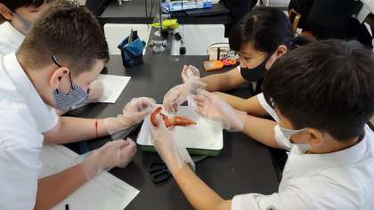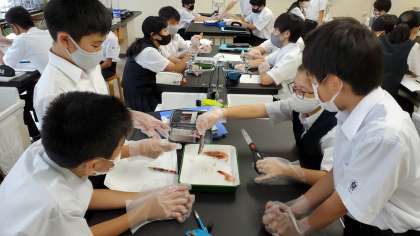 魚(メヒカリ)とエビを解剖し、動物による体のつくりの共通点と相違点を調べました。スーパーでよく目にする食材ですが、理科的な視点での観察に夢中になっていました。