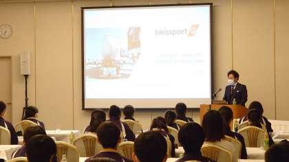 夕食後 同じ会場で、「職業講話」が行われました。実際に空港で働く方からの講話です。