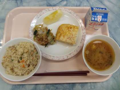 鶏ごぼうご飯は、鶏肉とごぼう、人参等を使用した和風の混ぜご飯です。混ぜご飯に、鶏肉やごぼう等の材料はよく合います。擬製豆腐は、豆腐を使用して卵焼きを作ることから、このような名前が付けられました。豆腐の割合の多い卵焼きで、柔らかい仕上がりになりました。