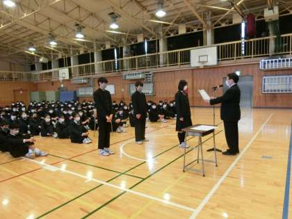 男子バスケットボール部、ソフトテニス部(男子)、市村アイディア賞、くじら川柳、一茶まつり俳句大会 それぞれの入賞者表彰でした。