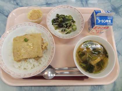 親子丼の献立は、生徒の食べやすい和食献立の一つです。まだ、学校が始まって間もないので、食べやすい給食から始め、少しずつ慣れていけたらいいと思います。駒中の親子丼は、ふわふわに仕上げた大きな卵焼きが1枚、ご飯の上にのります。これが人気のようです。豆乳を使用して作り、バニラ風味できな粉をかけた豆乳プリンも、人気のデザートです。