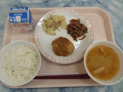 豚肉、鶏肉、豆腐を使用し、大根おろしソースをかけたヘルシーな和風ハンバーグは人気料理の一つです。豆腐を使用することで栄養価が増し、さっぱりといただけます。よく食べていました。付け合わせに、根菜類を使用したきんぴらと、ジャーマンポテトを提供しました。副菜と一緒に食べましょう。みそ汁は、白菜を使用しました。食べやすい和食献立でした。