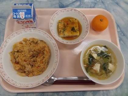 キムチチャーハンは、駒中生の人気料理です。キムチ風味がご飯を進めてくれるようです。中華風卵焼きは、かまぼこを加えた卵焼きに、中華風の甘酢あんをかけました。肉を使用していないので、さっぱりとしています。青菜のスープは、白菜、青梗菜、玉葱、人参、豆腐、鶏肉等を使用し、具だくさんな中華風野菜スープに仕上がりました。