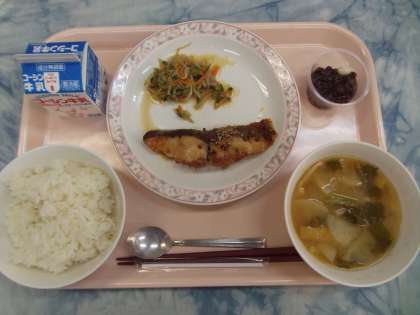 魚は、にんにく、しょうが、ねぎ、ごま、ごま油等を合わせた韓国風に味付けしたたれに漬け込み、焼きました。香辛料がよくきいていて、ご飯の進む一品となりました。韓国風味付けの魚料理に合わせて、中華風のお浸し・ナムルを提供しました。白玉小豆は、給食室で小豆を煮てあんこを作り、白玉にかけました。