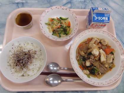 今回のふりかけはゆかりを使用し、ちりめんじゃこやごまと合わせました。肉豆腐は、食べやすい和食料理の一つで、焼き豆腐と豚肉をメインとした野菜の煮物です。サラダやデザートも人気料理です。全体的によく食べていました。