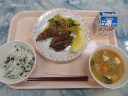 今日は昔よく使用されていた、鯨肉を竜田揚げにして提供しました。鯨肉をにんにく、しょうが、りんご等を合わせたたれに漬け込み、揚げました。鯨肉は高たんぱく質でビタミンAを豊富に含んでいて、低脂質なので、揚げ物料理に適しています。20gの切り身が3個つきました。昨日より、30日までは、学校給食週間です。今回は、昔なつかしい給食を提供しました。