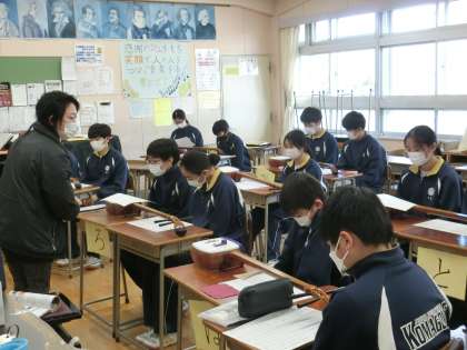 1年B組 音楽 和楽器(三味線)の授業です。調弦(チューニング)から行っています。