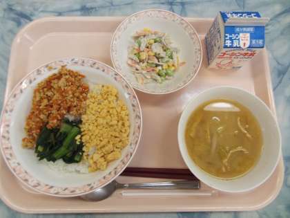 3色そぼろご飯は、炒り卵、鶏そぼろ、小松菜の3点をご飯に盛り付け一緒に食べます。配膳に少々手間がかかるのですが、甘めの味付けで、生徒の人気料理の一つです。スプーンをつけているので食べやすく、きちんと食べられていました。根菜サラダは、ごぼう、れんこん、コーン、枝豆等をマヨネーズドレッシングで味付けたサラダです。みそ汁は、キャベツ、しめじ等を使用しました。野菜類をたくさん使用した和食献立になりました。