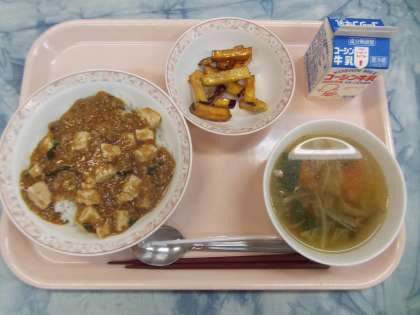 マーボー豆腐は、生徒からの人気メニューの一品です。ピリッと辛いマーボー豆腐が、ご飯を進めてくれるようです。スープは、もやし、キャベツ、鶏肉、ザーサイ等を使用した、中華スープです。さつまいものかりんとうはさつまいもを素揚げし、さとう、水あめ、ごま等で絡めました。ヘルシーで素朴なデザートです。よく食べていました。
