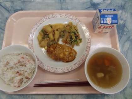 チーズ入りつくね焼きは、鶏ひき肉と豆腐のミンチに、角切りチーズを混ぜて焼き、甘辛いたれをかけたものです。生徒からのリクエストメニューです。甘辛い味付けは、生徒の好みのようです。じゃこ、ごま、チーズ、豆腐などを使用し、カルシウムが豊富な和食献立になりました。全体的に食べやすい和食献立で、よく食べていました。