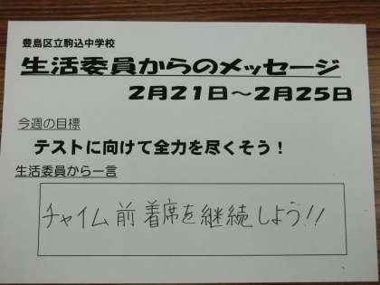 来週の「生活委員からのひとこと」は、「チャイム前着席を継続しよう!」です。来週は定期テストが行われます。チャイム前着席を継続して、落ち着いて学習に取り組める週にしましょう。