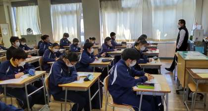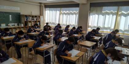 学年末の定期テスト3日目(最終日)です。社会、音楽、美術のテストを行いました。[1枚目の写真:1A]