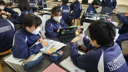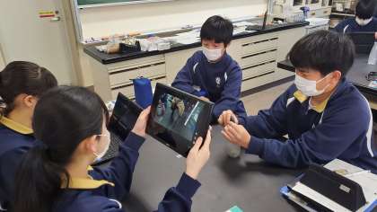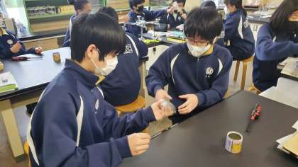 理科の授業では、雲のでき方を調べるために、ペットボトルに線香の煙と水を入れて加圧し、蓋を開けて減圧する実験を行いました。雲のでき方だけでなく、再度加圧することでできた雲が消えることも発見していました。