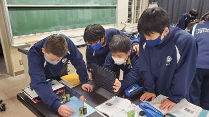 理科の授業では、鏡で反射した光がどのような道筋で進むのかを調べるために、実物とハーフミラーに映った像の位置の関係を調べる実験を行いました。