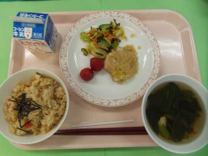 3月3日ひな祭りをお祝いした献立です。鶏肉のねぎ塩焼きは、焼いた鶏肉に、塩レモン味のねぎソースをかけて提供しました。ねぎの風味が感じられ、さっぱりとした仕上がりになりました。鶏肉料理は生徒は得意なようです。彩もよく、春らしいお祝い献立になりました。