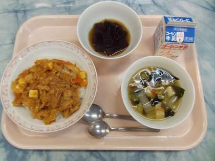 3月8日の給食 公開日 2022/03/08 更新日 2022/03/08 給食 チーズダッカルビ丼 中華スープ コーヒーゼリー 牛乳 チーズダッカルビは鶏肉と野菜をコチュジャンを使用した甘辛い炒め物で、韓国料理です。キムチも使用します。給食ではキムチの辛さをおさえて、甘みを出すために、ケチャップも使用しています。炒め物にチーズが加わり、生徒の好きな味付けのようです。中華スープは豆腐、わかめ等を使用し、さっぱりと仕上げました。 いいね(0)