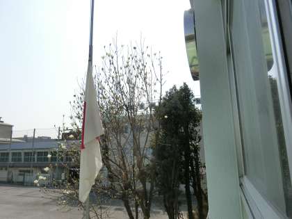半旗を掲げるとともに、職員による黙祷、お昼の放送では、東日本大震災による災害の大きさなどが話されました。