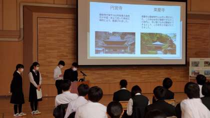 本日の5・6校時は、校外学習(第2学年)に向けた事前学習のまとめとして、班ごとに発表を行いました。班で与えられたテーマについて、Chromebookを活用してスライド資料をつくりました。