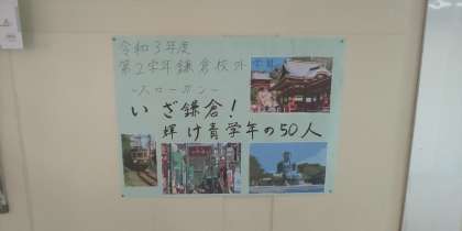 23日に予定されている鎌倉校外学習に向けて、実行委員会がスローガンを作成し、3F廊下に掲示しました。先日は事前学習発表会も無事に終え、着々と準備が進んでいます。